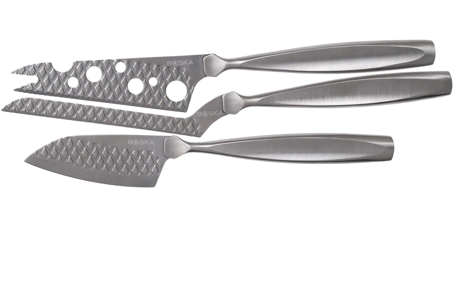 Este Juego de cuchillos de queso de Boska Monaco 307095 permite cortar cualquier tipo de queso. El juego consta de tres cuchillos diferentes, perfectos para cortar quesos blandos, semiduros y duros. Cortar el queso será un juego de niños gracias a este impresionante y funcional diseño combinado con un filo de navaja. Los cuchillos de acero inoxidable, aptos para el lavavajillas, están mejorados con una superficie texturizada para asegurar que el queso no se pegue a la hoja.
