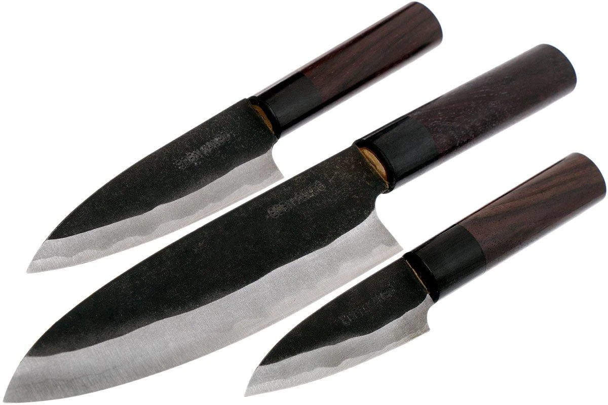 Juego de cuchillos de 3 piezas de la colección Eden Kanso Aogami. ¡Los cuchillos más afilados de nuestra gama! Hoja fina de acero al carbono muy resistente (Aogami # 2) para unas propiedades de corte perfectas.