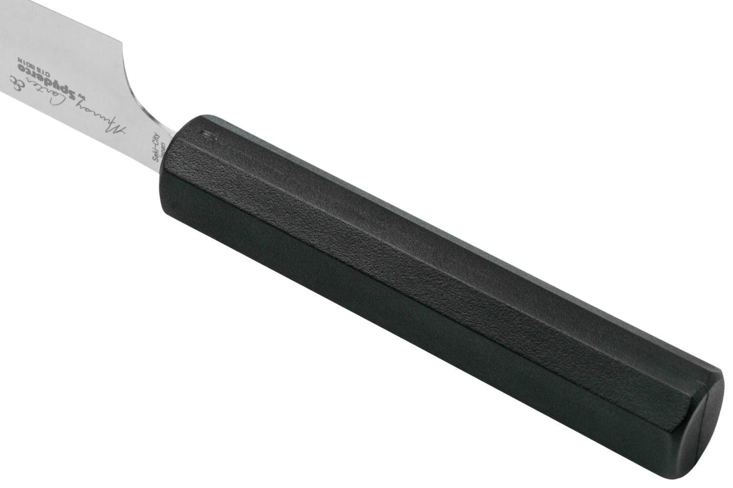 El Spyderco Minarai Petty de la Colección Murray Carter es el cuchillo más pequeño de esta colección. De la palabra francesa “petit” que significa “pequeño”, este cuchillo Petty es el equivalente a un cuchillo pelador occidental. Perfecto para pelar y cortar frutas y verduras y para hacer guarniciones detalladas para dar ese toque final.