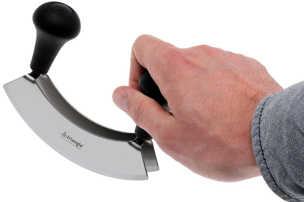 El picador de hierbas Triangle te ayuda a picar tus hierbas, ajos y cebollas muy finamente. Tiene dos hojas en forma de luna que son paralelas entre sí. La hoja curvada ayuda a que ruede sobre la tabla de cortar con facilidad. Las hojas son de acero inoxidable y se afilan a mano. La ventaja de un picador con dos hojas es que la velocidad aumenta considerablemente. También ayuda a cortar mucho más fino en comparación con una sola hoja.