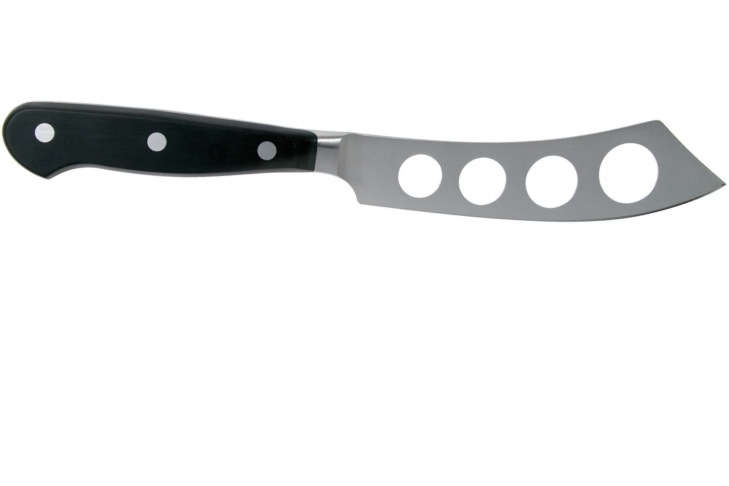 Este cuchillo de queso Wüsthof Classic es ideal cuando necesitas cortar quesos blandos y semiduros. Tanto si quieres disfrutar de un trozo de French Morbier o Le Moulis, un Roem de Alkmaar o un Pecorino, Riserva de Toscana: este cuchillo Wüsthof cortará fácilmente a través de él. La hoja está reforzada con agujeros para asegurarse de que el queso no se pegue a la hoja. Gracias al borde afilado tu queso no perderá su forma.